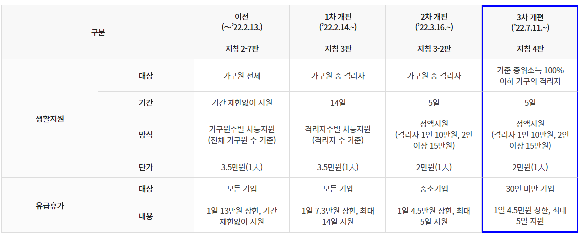 코로나 유급휴가 지원금 신청방법과 신청대상,신청기간,지원금액 등에 대해서 알아보았다. 19년도부터 시작된 장기적인 코로나로 인해 처음 도입했던 유급휴가 지원금과 생활지원비의 금액도 많이 달라졌다. 2022년 7월 11일 이후 개편되었고 격리 시점에 따라 기준이 달리 적용되니 유의하길 바란다.
